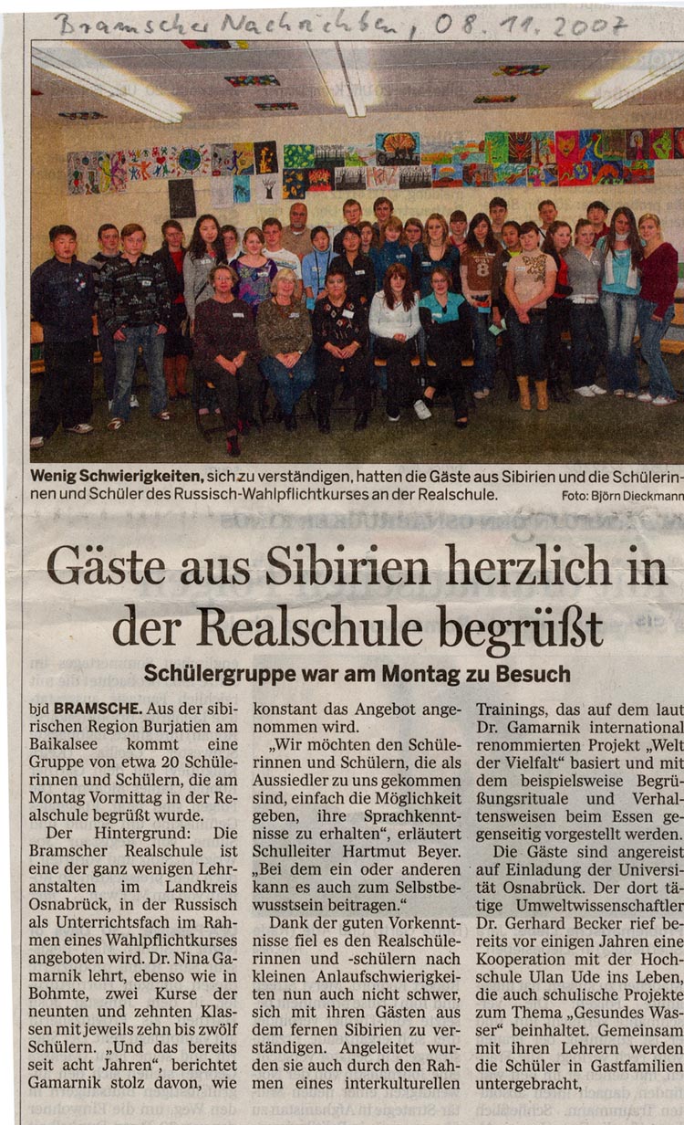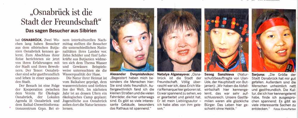 This article contains several "mistakes". The visitors came from the Russian Republic Buryatia (German: Burjatien), not from 'Burjanien'. The picture over Seseg Sanzhieva's quotation shows the teacher Zhargalma Advokatova. The cooperation takes place between the "Verein für Ökologie und Umweltbildung Osnabrück e.V." and the "AK Umweltbildung der Lokalen Agenda 21" on the German side and the Baikal Information Centre GRAN.