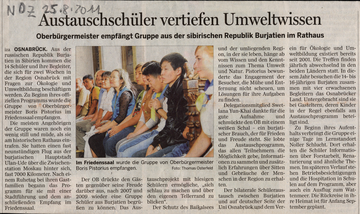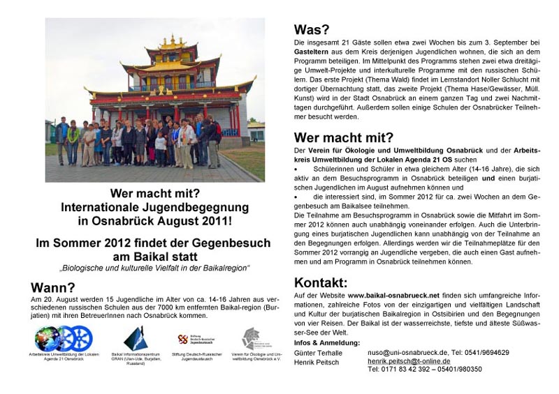Nach bereits vier erfolgreichen Begegnungen in Osnabrück und am Baikal seit 2007 laufen zurzeit die Vorbereitungen für eine weitere Runde des internationalen Jugendaustausches. Der Verein für Ökologie und Umweltbildung Osnabrück sucht hierfür noch einige Schülerinnen und Schüler im Alter zwischen 14 und 16 Jahren, die sich an dem zweiwöchigen Programm beteiligen wollen und interessiert sind, etwa Mitte August 2012 zu einem Gegenbesuch nach Burjatien mitzufahren.