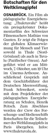 Die beiden Kurzfilme der Montesori-Schule und der Stüveschule bildeten den Auftakt der Vorführung. Der Film Thule Tuvalu steht den Onsabrücker Schulen für Sondervorstellung im Cinema Arthouse zur Verfügung.