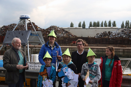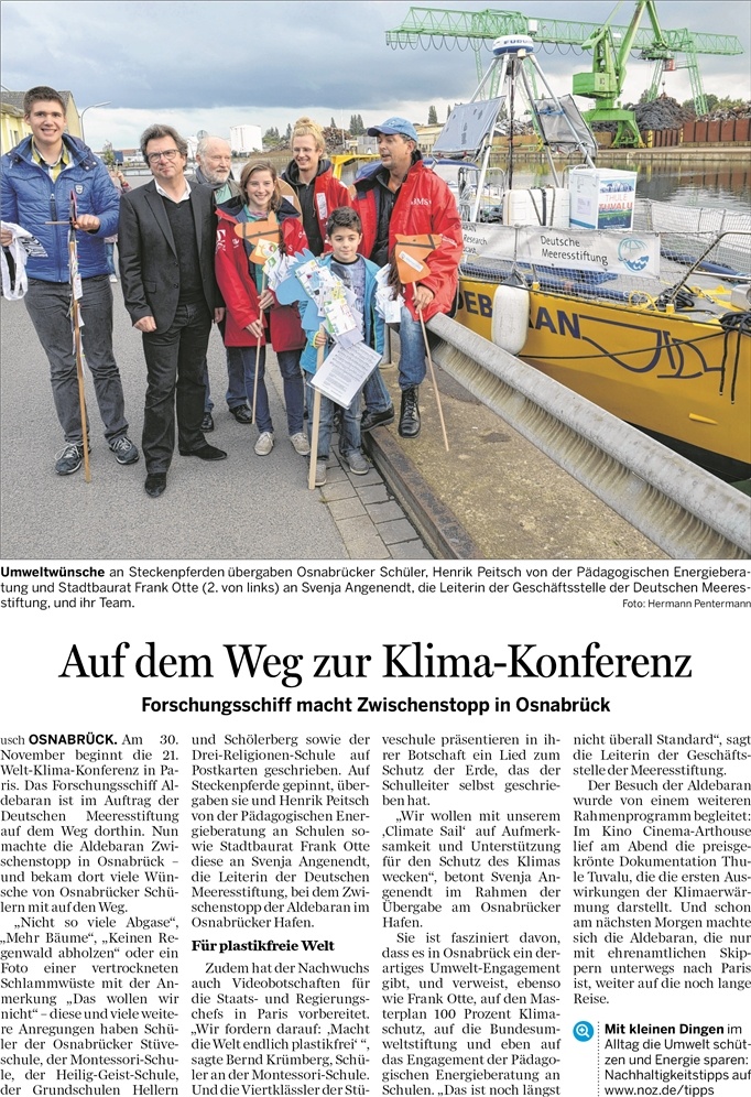 Das Medien- und Forschungsschiff Aldebaran der Deutschen Meeresstiftung hat am Mittwoch, 7. Oktober, im Osnabrücker Hafen angelegt und einige Osnabrücker überraschten die Crew mit einem Empfang. Das Schiff ist auf dem Weg zur internationalen UN-Klimakonferenz in Paris und nimmt nun Steckenpferde aus Osnabrück mit, die voll gespickt sind mit Klimabotschaften. Svenja Angenendt von der Besatzung dankte besonders den Jungen und Mädchen für die Steckenpferde, die eine zweifache Symbolik zum Ausdruck brächten: Forderungen an die Klimakonferenz und Friedensbotschaften. Die Delegationen der Stüveschule und der Montessori Schule freuten sich über das Lob.