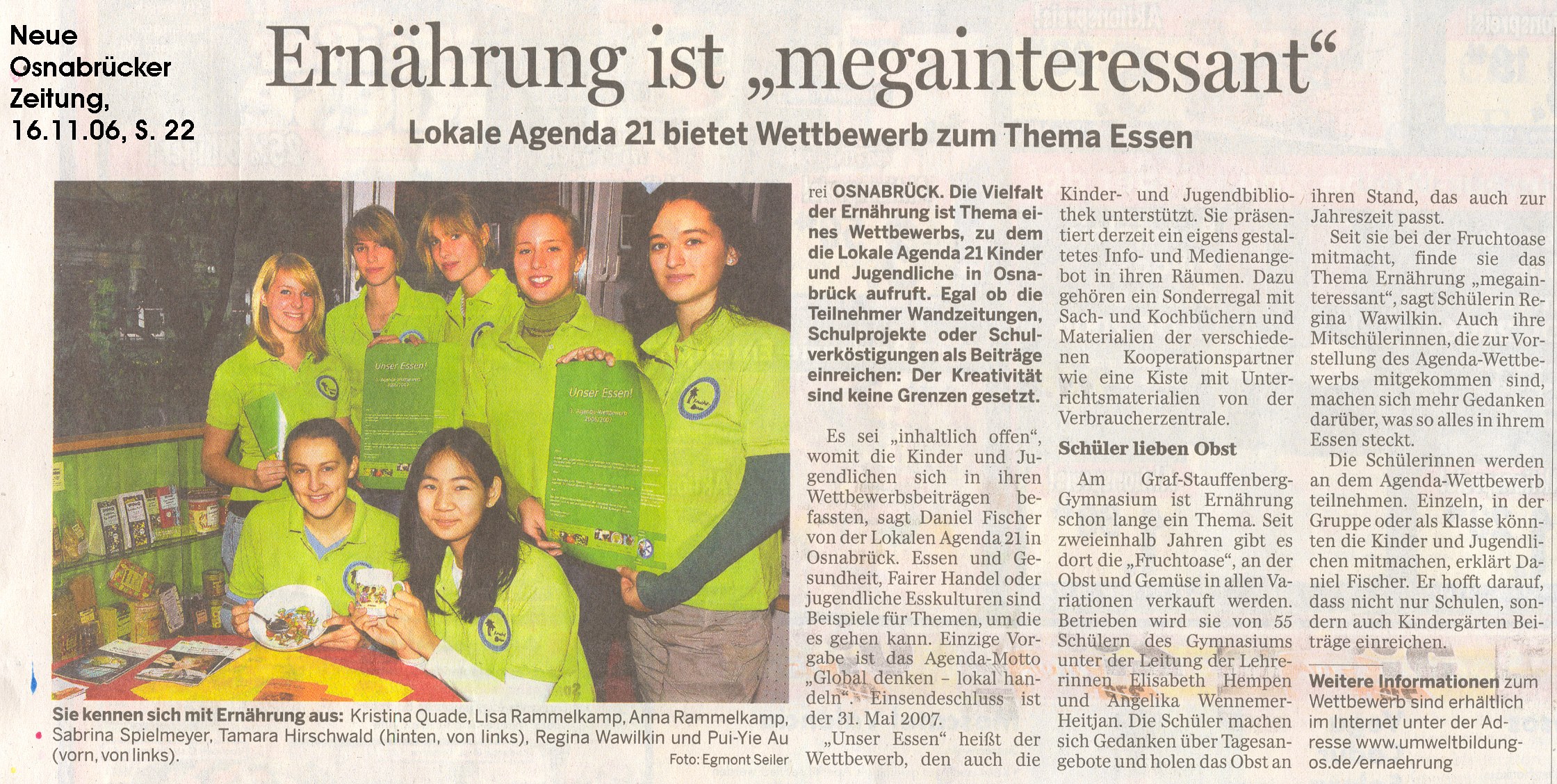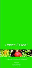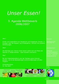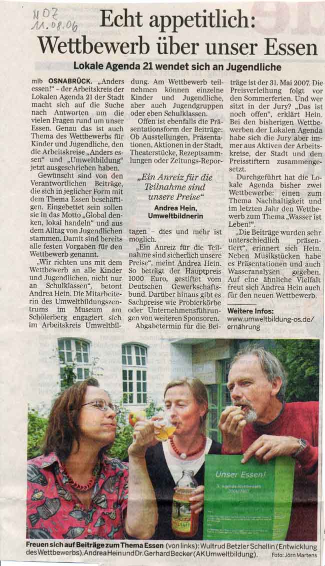 Unser Essen! 3. Agenda-Wettbewerb 2006/2007 Getreu dem Motto „Du bist, was Du isst“ startete Anfang Juli 2006 der 3. Wettbewerb der Arbeitskreise „Umweltbildung“ und „Anders Essen“ der Lokalen Agenda 21 in Osnabrück zum Thema Ernährung. Es wurden bis zum letzten Abgabetermin am 31.Mai 2007 20 Beiträge eingereicht. Die externe Jury vergab Preise und Auszeichnungen nach unterschiedlichen Kategorien. Mehr dazu auf der Preisverleihung am 3. Juli 2007 um 16:00 Uhr im Haus der Jugend mit Herrn Fip (ehem. OB) als Schirmherr.Wettbewerbsbeitraege - Sendung in Osradio am 6.7.2007 | ||