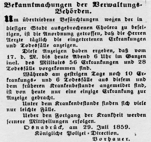 | Abb. 6: Eine Anzeige des Osnabrückischen Anzeigers vom 30.07.1859: Trotz der zahlreichen Toten versuchte die Polizei-Direction die Epidemie zu verharmlosen. Von den 295 erkrankten Menschen starben 149 an der Seuche. |