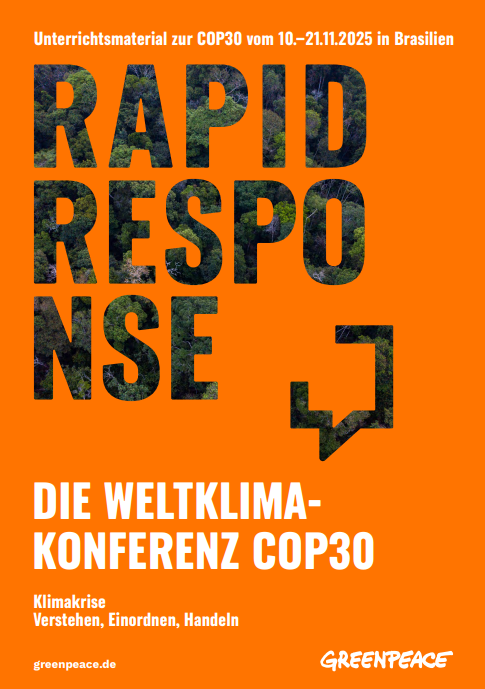 Greenpeace: Wenn in Belém ab dem 10. November 2025 voraussichtlich 70.000 Menschen aus der gesamten Welt über nächste Schritte gegen die Klimakrise verhandeln, wird die Medienpräsenz der Weltklimakonferenz sehr hoch sein. Ziel des vorliegenden Unterrichtsmaterials ist, Ihre Schüler:innen für dieses aktuelle klimapolitische Großereignis zu interessieren und sie dabei zu unterstützen, Themen und Verlauf der Konferenz zu verstehen und deren Ergebnisse vor dem Hintergrund der fortschreitenden Klimakrise zu bewerten.