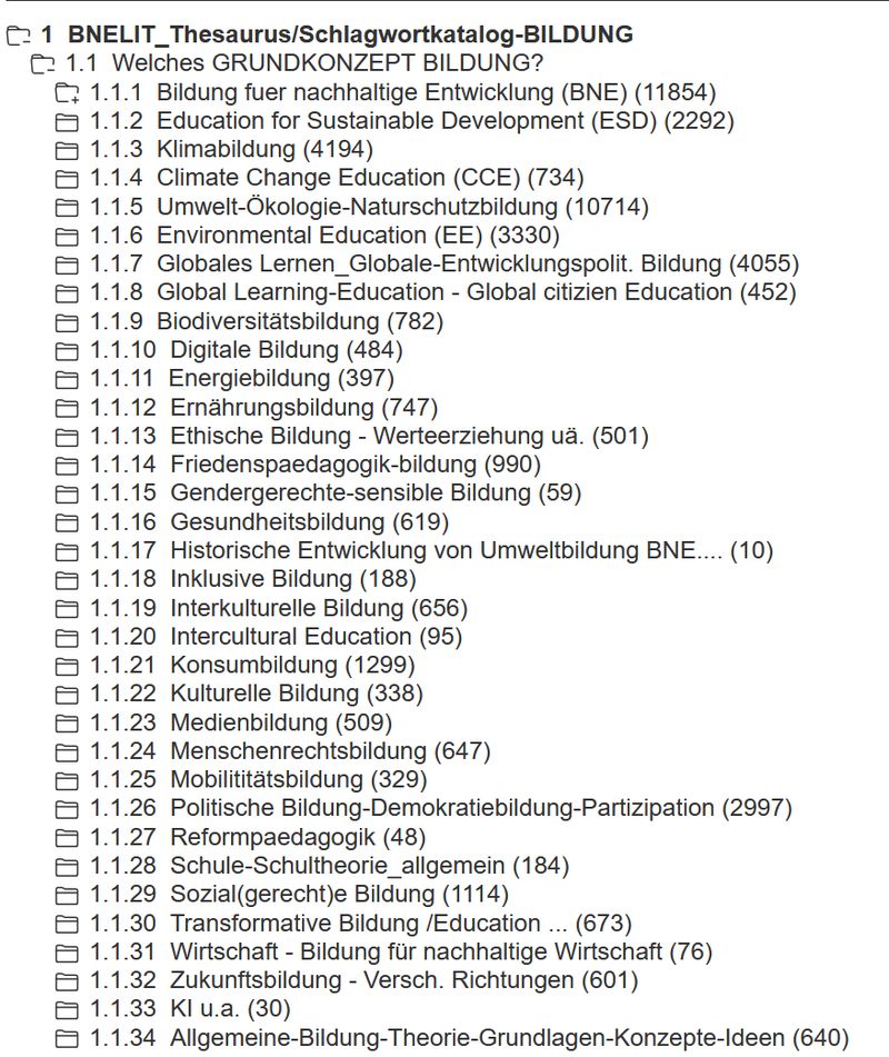 Für die jetzt angezeigten Unterbereiche mit + kann man jeweils eine weitere Ebene tiefer gehen. Dies gilt z.B. für "Grundkonzepte". Für diese zunächst ausgewählten Konzepte Klimabildung, Biodiversitätsbildung, Umweltbildung, Globales Lernen muss man wieder auf + am linken Rand klicken