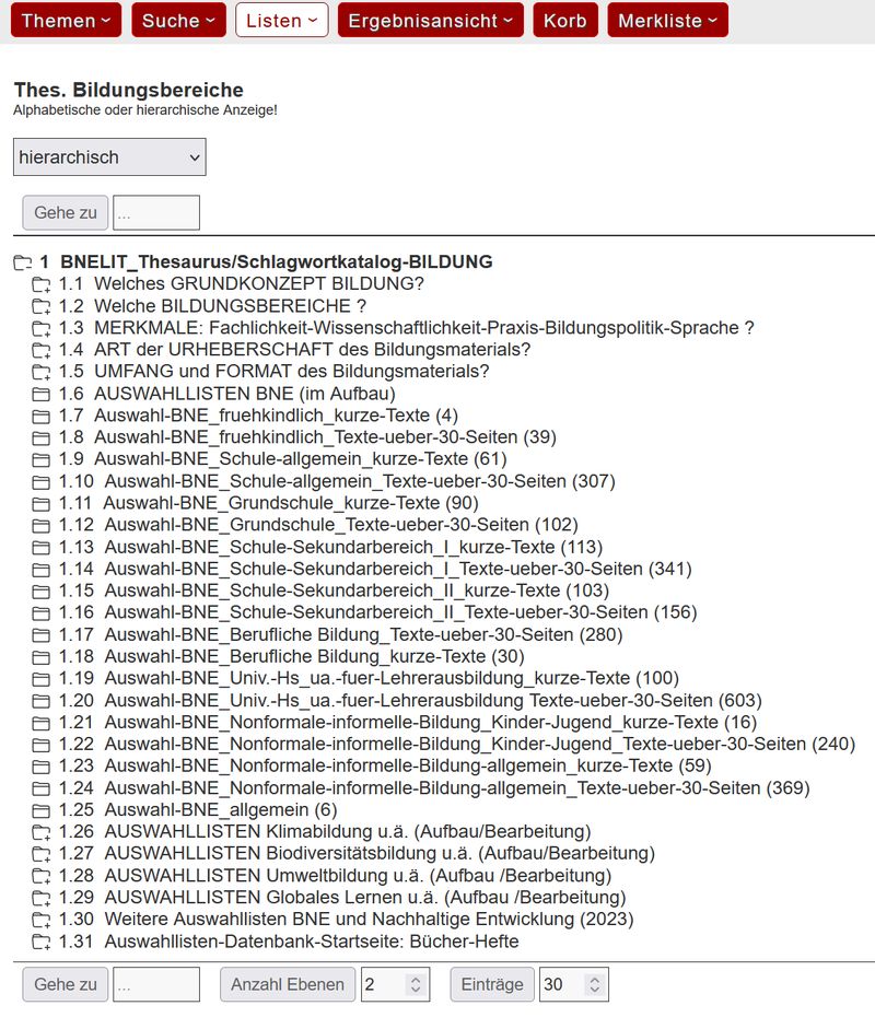 Es werden auf dieser Ebene bereits Listen für verschiedene Bildungsbereiche für BNE angezeigt.