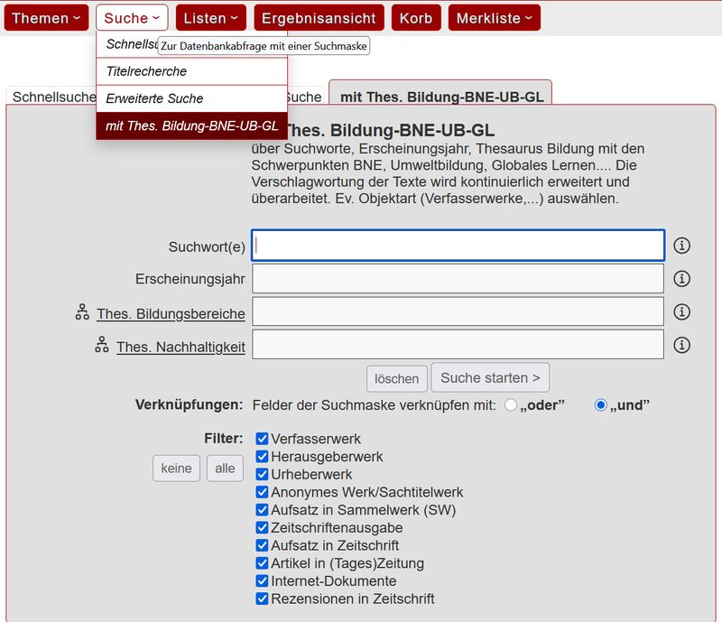 Es gibt mehrere Suchmasken mit unterschiedlichen genutzten Feldern, z.B. auch mit 2 Schlagwortkatalogen/Thesauri, die auch direkt genutzt werden können (s. darunter)