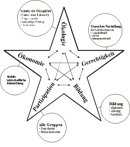 Um kein Mißverständnis aufkommen zu lassen: Wenn hier die gesellschaftliche und die politische Ebene aus den genannten Gründen einer differenzierten, analytischen Einschätzung betont wird, dann bedeutet dies in der Konsequenz nicht, (Umwelt)Pädagogik instrumentell auf eine gesellschaftliche bzw. politische Funktion im Prozeß der Modernisierung verkürzen zu wollen (vgl. 5.3). Im Gegenteil wird die im politischen Raum und im Nachhaltigkeitsdiskurs eindeutig vorherrschende instrumentelle Sichtweise der Umweltbildung und der Bildung für eine nachhaltige Entwicklung kritisch beurteilt. Deshalb wird sowohl dem Partizipationsgedanken als auch der Bildung eine eigenständige Rolle und damit ein größeres Gewicht im Verständnis einer nachhaltigen Entwicklung zugemessen (s. „Stern der Nachhaltigkeit“ in 3.3.2). Unterstützt wird diese bildungstheoretisch begründbare Position[4] durch die bisher wenig beachteten internationalen und weltweiten Bemühungen der UNESCO um eine neue Bildung (s. 3.3.1).