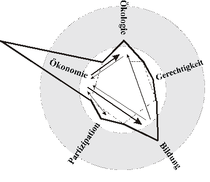 Verkomplizierend ist noch der - der Mehrdimensionalität der Nachhaltigkeit geschuldete - Umstand, daß es keine linearen Zusammenhänge zwischen Modellen der nachhaltigen Entwicklung und ihrer Dimension der Partizipation gibt. Ökologisch weitreichende Strategien der nachhaltigen Entwicklung sind nicht notwendig mit erweiterten Partizipationsperspektiven verbunden, sondern haben sogar oft die Tendenz eines Top-down-Modells. Umgekehrt kann Partizipation sich auf reine Interessenpolitik und Lobbyismus reduzieren, wenn ein Wille zur gemeinsamen nachhaltigen Entwicklung nicht hinreichend ausgeprägt ist. Daraus leite ich folgende These ab und darauf basierend die Erweiterung der Dimensionen des Verständnisses von nachhaltiger Entwicklung (s. Abb. 3.1 „Stern der nachhaltigen Entwicklung“ in 3.3.2).