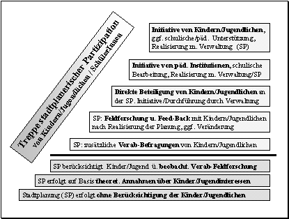 [124]Es gibt dazu erst punktuelle Ansätze z. B. Kinderfreundliche Stadt in Hessen (Hess. Ministerium für Landesentwicklung 1991/1992), Kinderstadt in München (Grüneisl/Zacharias 1989), auch einige Ansätze auf rechtlicher Basis , z. B. im Rahmen der Gemeindeordnung in Schleswig-Holstein (vgl. Deutsches Kinderhilfswerk e. V. (1997a). Die rechtlichen Möglichkeiten des Kinder- und Jugendhilfe-Gesetzes von 1992 werden offenbar noch gar nicht ausgeschöpft - sei es aus Unkenntnis der Möglichkeiten bei allen Betroffenen in und außerhalb der Verwaltung, sei es aus Gründen traditioneller Verwaltungsstrukturen.